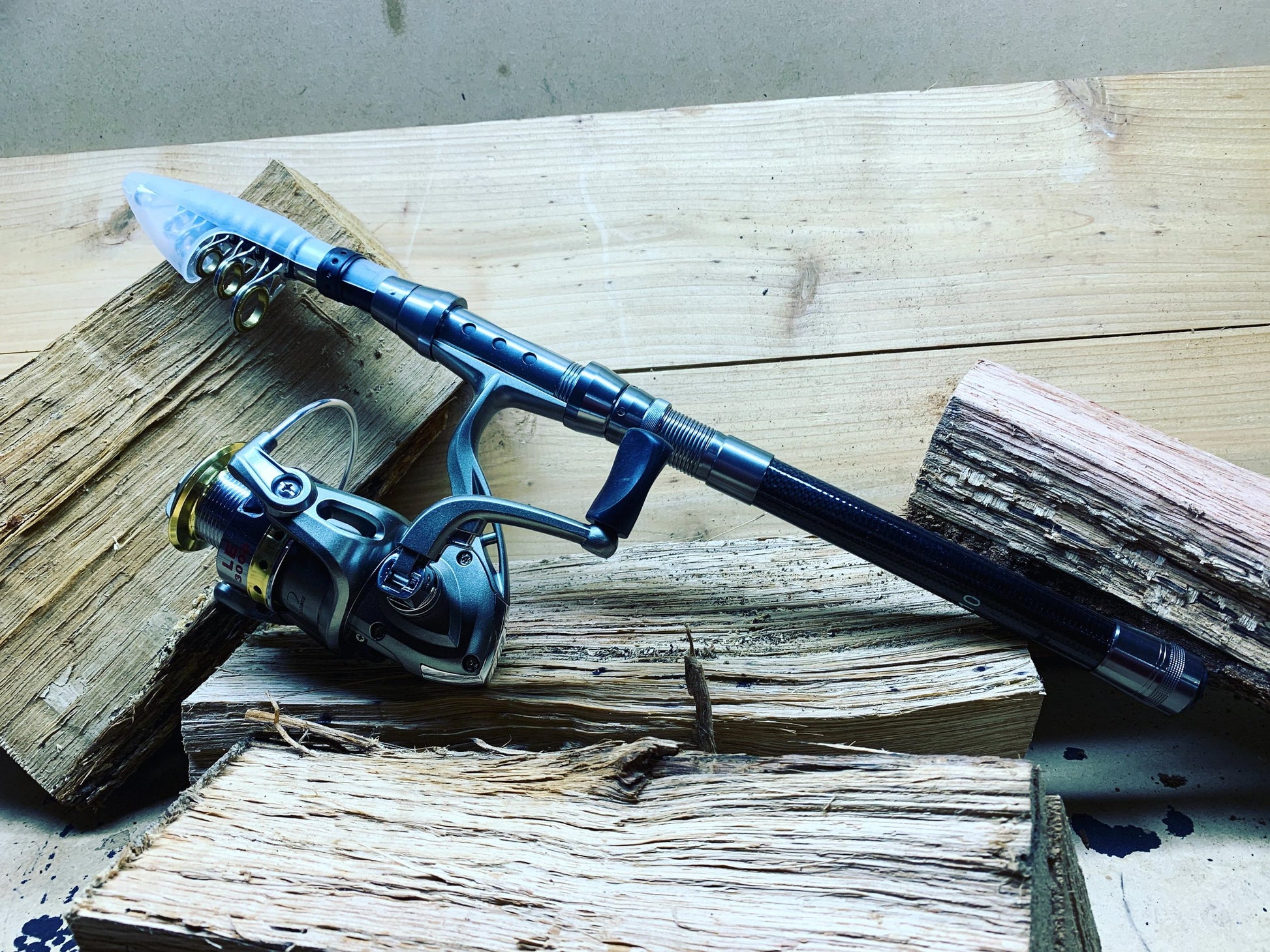 A quality carbon fiber and titanium fishing rod which extends to a length of 6' 8". The graphite and steel construction reel also collapses.